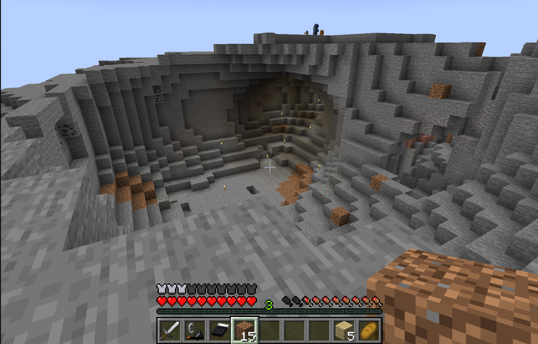In the first image, you can see some birchwood blanks laying around as I plan out a castle which will eventually take up the island. My goal is to plot out where the walls of the cave will be, dig out what I don't need, and use that to make stone bricks to build the rest of the castle on top of walls left over from the excavation. From here, I'll build up a town, and eventually, taking up the process of populating the town with villagers, rescued from being naturally occuring zombie villagers.